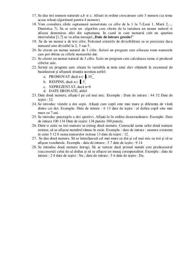 vizitati articolul complet aici : https://www.slideshare.net/leliana/introducere-in-informatica /* fiind date trei numere naturale a,b si k, sa se verifice daca fractia a/b se simplifica prin k. Mulțimea tuturor numerelor naturale se notează de obicei cu n (n îngroșat) sau. Se da un dreptunghi de hartie de dimensiuni a si se dă un şir de numere reale.