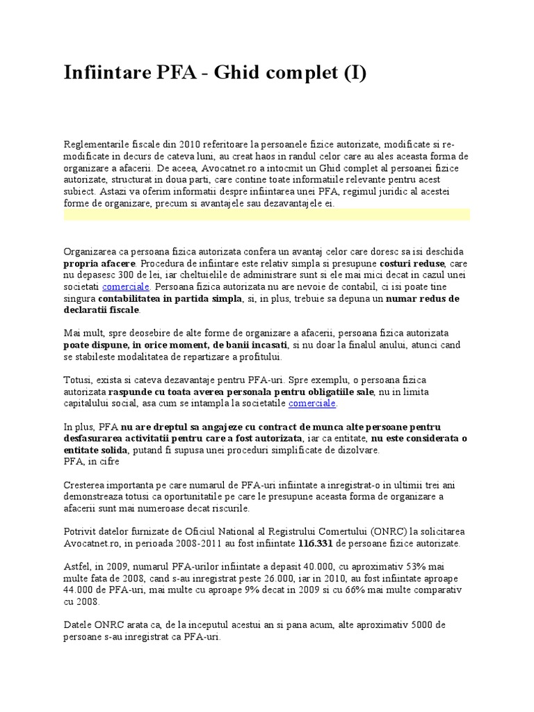 vizitati articolul complet aici : https://www.slideshare.net/funkybaby/aproape-totul-despre-pfa Una din marile nelămuriri ale celor care doresc să se autorizeze ca pfa, este aceea că nu ştiu dacă se pot autoriza pe mai multe domenii de activitate. O lună consultanță gratuită inclusă. Acest ghid util pentru infiintarea unui pfa ofera informatii legate de procedurile necesare pentru a garanta desfasurarea legala a unei activitati economice de catre o persoana autorizata.